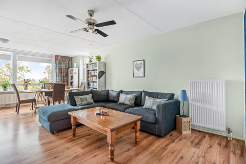 De woonkamer is, samen met de open keuken, bijna 29m2 groot en voorzien van een laminaatvloer en een goede wandafwerking. Dankzij de ligging op een hoek heeft deze kamer een groot hoekraam wat ervoor zorgt dat er hier lekker veel licht naar binnen komt.